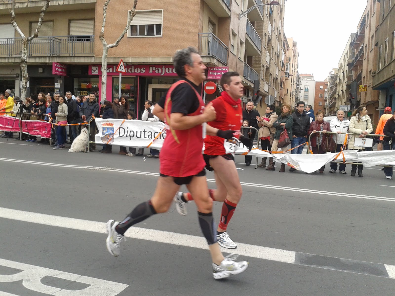Y ¿ quién dijo que la carrera de Salamanca era llana ? ¿Llana?, eso es lo que usan los albañiles para dar el yeso. Un buen rompepiernas. El típico circuito urbano en el que no coges el ritmo ni a la de tres. De pronto una cuesta abajo, ahora un giro a la derecha, luego para arriba, ahora el carril-bici… Los primeros kilómetros por la ciudad, impresionantes, con un montón de gente, aunque eso fue una constante a lo largo de toda la carrera. El paso por la calle Toro, la Plaza Mayor, alucinantes. Pero claro, calles estrechas, 1.800 locos corriendo un domingo por la mañana. Así, llegamos a un parque al lado del río Tormes y entre bolardos, bordillos, fuentes, etc, aquello se convirtió en una carrera de alto riesgo. El Presi e Ismael vieron como un colega se destrozaba la rodilla en un obstáculo de los muchos que había en esa zona. Yo tuve que abrirme literalmente de piernas para no comerme un cubo de granito que por allí estaba colocado. Salimos hacia el río, carril bici, cuesta va, llano viene… pum, pum. Cada uno, a su ritmo, iba como podía. Nos encontramos con el amigo de Jarandilla Marcelino, con otro colega de Las Casas del Castañar…También al cruzar uno de los puentes nos llegó una de las alegrías del día